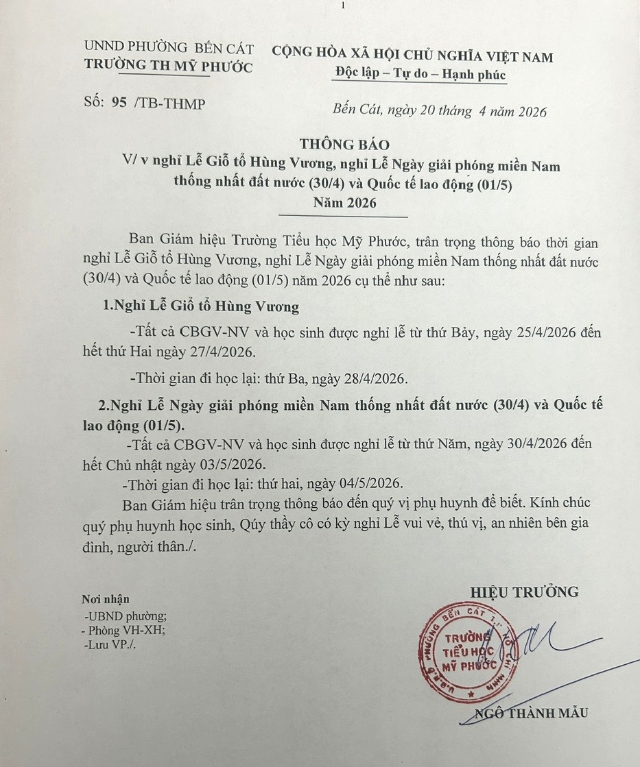 Ngày ban hành: 24/04/2024. Trích yếu: Thông báo về việc treo Quốc kỳ và nghỉ lễ kỉ niệm 49 năm ngày Giải phóng hoàn toàn miền năm - thống nhất đất nước (30/4/1975-30/4/2024) và Quốc tế lao động 01/5